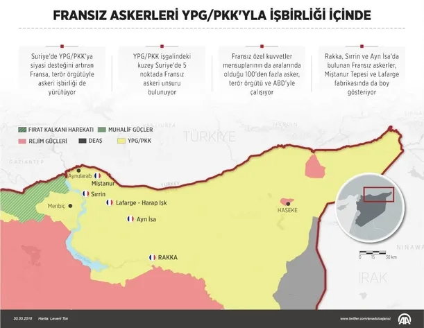 Suriye'de YPG/PKK'ya siyasi desteğini artıran Fransa, terör örgütüyle askeri işbirliği de yürütüyor. YPG/PKK işgalindeki kuzey Suriye'de en az 5 noktada Fransız askeri unsuru bulunuyor.