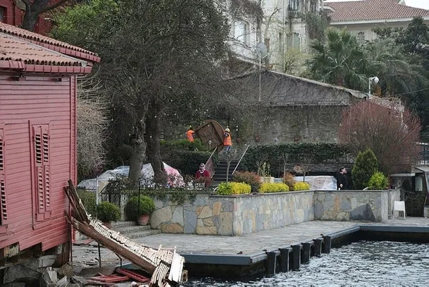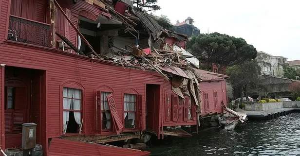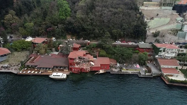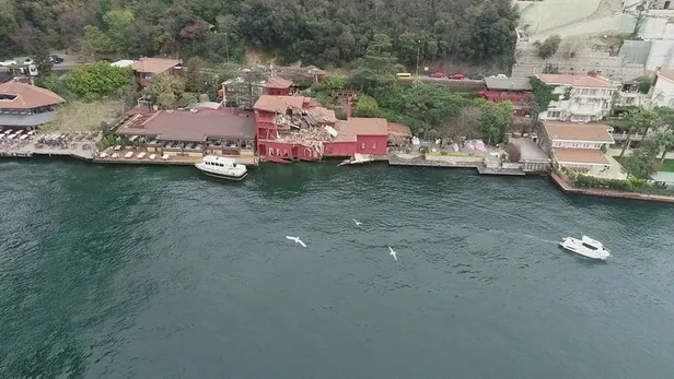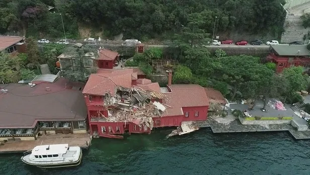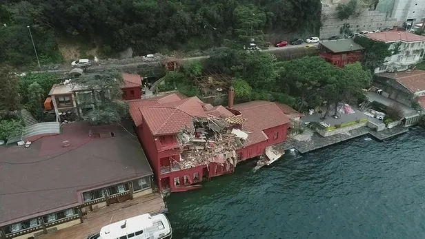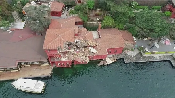 Havadan çekilen görüntülerde yalıdaki büyük hasar görülürken, bir bölümünün denize doğru kaydığı görülüyor.