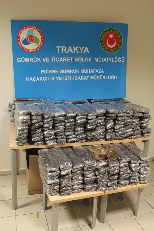 Edirne Kapıkule Sınır Kapısı’ndan, sürücülüğünü Sırp uyruklu şahsın yaptığı yabancı plakalı boş TIR'da, piyasa değeri yaklaşık 3 milyon 900 bin TL değerinde 153 kilogram esrar ele geçirildi