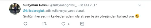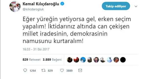 Yine sosyal medya hesabından yaptığı bir başka paylaşımda Kemal Kılıçdaroğlu, yerel seçimler için de iktidara meydan okuyor. Sosyal medyadan iktidara meydan okuyan, "halkın kararından korkmuyorsanız gelin erken seçim yapalım" diyen Kılıçdaroğlu'nun her seçimde halktan yediği demokrasi tokatları ise saymakla bitmiyor. Halktan korkmakla itham ettiği iktidar partisi ise her seçimde Kılıçdaroğlu'na karşı seçimden galip çıkıyor.