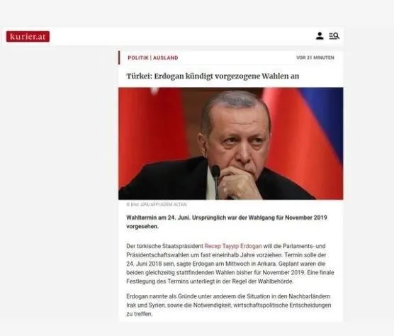 Avusturya'nın Kurier gazetesi de son dakika olarak duyurduğu haberinde 'Türkiye erken seçime gidiyor' manşeti attı.