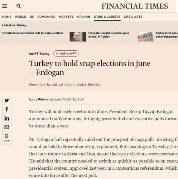 İngiliz ekonomi gazetesi Financial Times, Erdoğan'ın açıklamasını son dakika gelişmesi olarak verirken, "Erdoğan geçmiş dönemde erken seçim iddialarını yalanlamıştı. Fakat konuşmasında Suriye ve Irak'taki belirsizliklerin erken seçimi gerekli hale getirdiğini dile getirdi" ifadeleri kullanıldı.