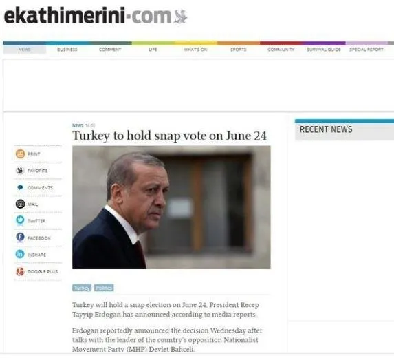 Yunanistan'ın Ekathimerini gazetesi, Cumhurbaşkanı Erdoğan'ın fotoğrafıyla son dakika duyurduğu haberinde, "Türkiye 24 Haziran'da erken seçime gidiyor" başlığını kullandı.