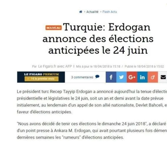 Fransız gazetesi Le Figaro yine manşetten ve son dakika olarak duyurduğu haberinde 'Erdoğanaçıkladı, Türkiye 24 Haziran'da erken seçime gidiyor' ifadelerini kullandı.