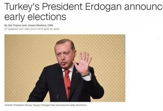 MHP lideri Devlet Bahçeli’nin partisinin grup toplantısında erken seçim çağrısından sonra dün Cumhurbaşkanlığı Külliyesi’nde Erdoğan ve Bahçeli arasında kritik bir görüşme yapıldı. Bahçeli ile yarım saat süren toplantısının ardından kurmaylarıyla da bir araya gelen Cumhurbaşkanı Erdoğan bu toplantının sonrasında basın açıklaması yaptı. Erdoğan basın açıklamasında erken seçimlerin 24 Haziran 2018 tarihinde gerçekleşeceğini açıkladı. Erdoğan’ın bu açıklaması dünya basınında da geniş yankı uyandırdı. İşte dünya basının 24 Haziran’da gerçekleşecek seçimlerle ilgili son dakika olarak geçtikleri haberler:
