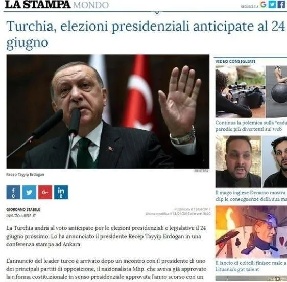 İtalya'nın La Stampa gazetesi, son dakika olarak duyurduğu haberinde 'Türkiye'de cumhurbaşkanlığı seçimleri 24 Haziran'a alındı' ifadeleri yer aldı.