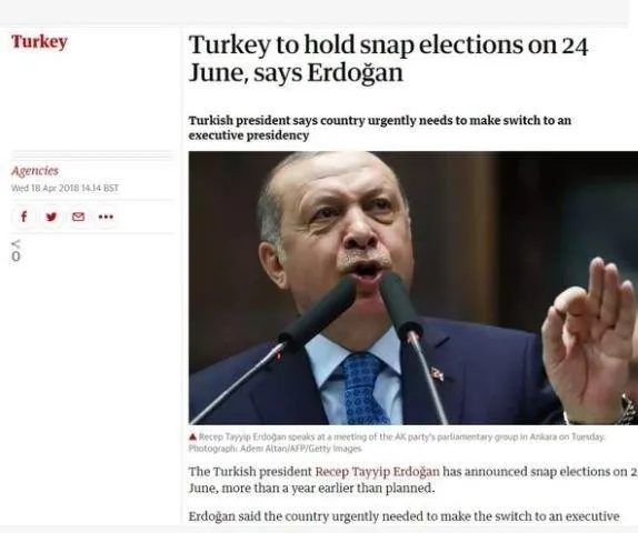 İngiltere'nin köklü gazetesi The Guardian, 'Erdoğan, Türkiye'yi 24 Haziran'da seçime götürüyor' ifadelerini kullanırken, yeni sistemin bir an önce devreye sokulması isteniyor bilgisi paylaşıldı.