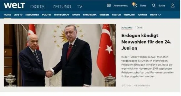 Alman Die Welt gazetesi, Beştepe'de gerçekleşen zirveye geniş yer ayırırken, 'Erdoğan, 24 Haziran'da erken seçime gidileceğini açıkladı' başlığını attı.