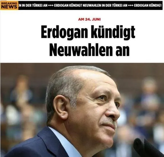 Alman Bild gazetesi, son dakika olarak duyurdu haberinde 'Erdoğan yeni seçim tarihini açıkladı' başlığını attı.