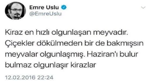 FETÖ'cü hainlerin 15 Temmuz darbe girişimi öncesi 'Haziran' ve 'kiraz' temalı tweetler atıp örgüt üyelerine mesaj verdiği ortaya çıktı. Bu mesajlardan birsi de FETÖ'nün sosyal medya soytarısı Emre Uslu'ya ait. Emre Uslu'nun darbeden 5 ay önce attığı twitte "Kiraz en hızlı olgunlaşan meyvedir. Çiçekler dökülmeden bir de bakmışsın kirazlar olgunlaşmış. Haziran'ı bulur bulmaz olgunlaşır kirazlar" şeklinde mesaj attığı ortaya çıktı.