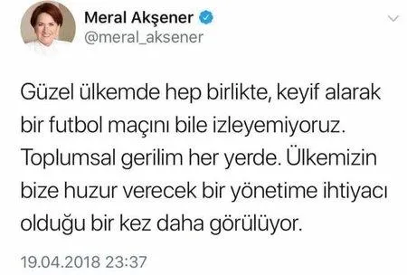 Yarıda kalan maçı bahane ederek halkı provoke etmeye çalışan Akşener sosyal medyadan "Toplumsal gerilim her yerde. Ülkemizin bize huzur verecek bir yönetime ihtiyacı olduğu bir kez daha görülüyor" şeklinde bir mesaj paylaştı.