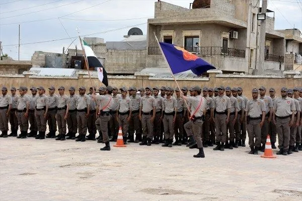 Türk polis teşkilatından yetkililerin de katıldığı törende mezun polislerin Türk bayrakları taşıdığı görüldü. Bu arada, Azez emniyeti, yeni polis adayları aradığını duyurdu.