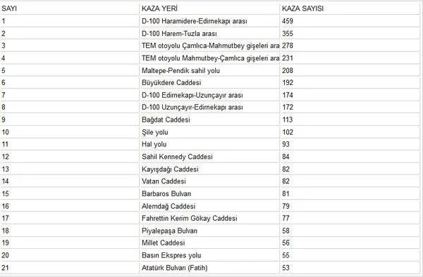 Bunu 355 kaza ile D-100 Karayolu'nun Harem-Tuzla arası, 278 kaza ile TEM Otoyolu'nun Çamlıca ile Mahmutbey gişeleri arasındaki bölge takip etti.
