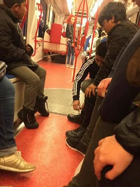 Oturduğu yerden kalkan genç, çocuğun yanına giderek sobhet etmeye başladı. Genç sohbetin ardından ayağındaki ayakkabıları çıkarıp, çocuğa verdi. Ayakkabıları çocuğun ayağına giydirip bağcıklarını da bağlayan genç, yerine dönüp, çorapla yoluna devam etti.