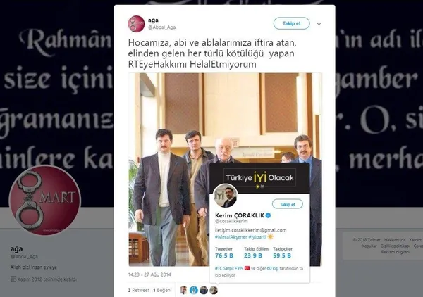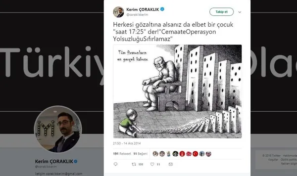 İYİ Parti'nin Genel Merkez İletişim Sorumlusu Kerim Çoraklık'ın FETÖ propagandası suçunu işlediğine yönelik paylaşımları şöyle: