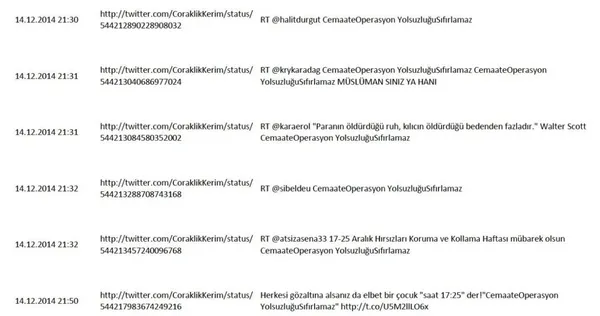 Kerim Çoraklık, 4 Şubat 2015 tarihli paylaşımında, "Cemaat, Cumurbaşkanı'na kafayı yedirmek suretiyle darbeye hazırlanıyor. Kesin bilgi yayalım! RT RT RT" ifadelerini kullanmış