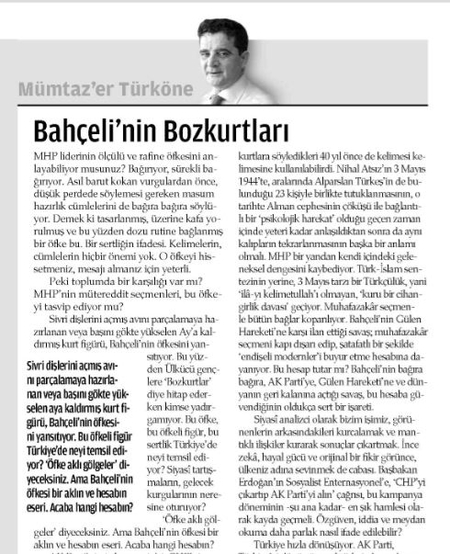 5 Mayıs 2011: Zaman gazetesi yazarı Mümtazer Türköne de; "Bahçeli'nin bozkurtları" başlıklı köşe yazısında; Devlet Bahçeli'yi hedef aldı ve "Sivri dişlerini açmış avını parçalamaya hazırlanan veya başını gökte yükselen Ay'a kaldırmış kurt figürü, Bahçeli'nin öfkesini yansıtıyor. Bu öfke, bu öfkeli figür, bu sertlik Türkiye'de neyi temsil ediyor? Bahçeli'nin öfkesi bir aklın ve hesabın eseri. Acaba hangi hesabın? Bahçeli'nin Gülen Hareketi'ne karşı ilan ettiği savaş; muhafazakâr seçmeni kapı dışarı edip, şatafatlı bir şekilde 'endişeli modernler'i buyur etme hesabına dayanıyor" iddiasında bulundu.