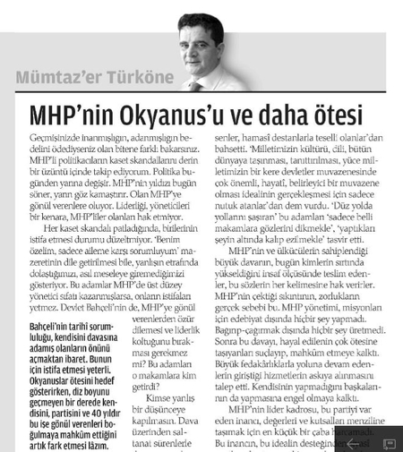 12 Mayıs 2011: Zaman gazetesi yazarı Mümtazer Türköne'nin, "MHP'nin Okyanus'u ve daha ötesi" başlıklı köşe yazısında; "Devlet Bahçeli'nin tarihî sorumluluğu, kendisini inancına, davasına adamış olanların önünü açmaktan ibaret. Bunun için istifa etmesi yeterli. Okyanuslar ötesini hedef gösterirken, diz boyunu geçmeyen bir derede kendisini, partisini ve 40 yıldır bu işe gönül verenleri boğulmaya mahkûm ettiğini artık fark etmesi lâzım" iddiasında bulundu.