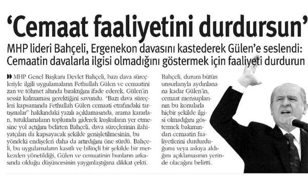 Devlet Bahçeli, 31 Mart 2011 tarihinde yazılı açıklamada bulundu ve terörist başı Fetullah Gülen'e çağrıda bulundu ve faaliyetlerini durdurmasını istedi.