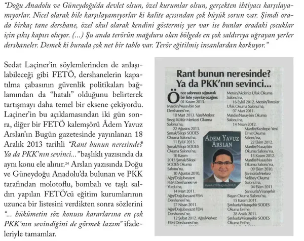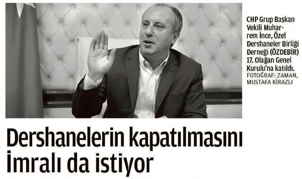 Aynı İnce "Kenan Paşa başaramadı dershaneleri kapatmayı, Recep paşa başarabilir, demedi demeyin. İmralı'da bir eş başkan var. O da istiyor sizin kapatılmanızı" demiş, yine o dönem FETÖ ile aynı ağzı kullanarak dershanelerin kapatılmasına karşı çıkmıştır.