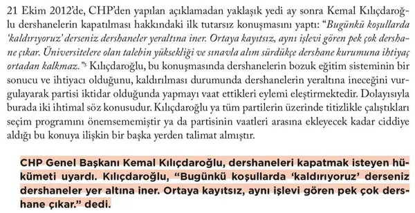 FETÖ konusunda da meydanlarda "bizim dönemimizde kimse kanmayacak" sloganları atan CHP'lilerin FETÖ yuvası olan dershanelerin kapatılması konusuna da FETÖ ağzıyla karşıyla çıkmıştı.