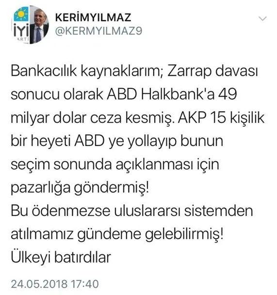 İP'li Kerim Yılmaz, twitterdan FETÖ'nün yalanlarını köpürttü, Türk ekonomisine ceza kesildiği yalanının savurdu, Halkbank'a ve Türkiye'ye iftira attı.