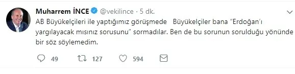 Kendi söylediği sözleri inkar eden İnce attığı tweet'te "AB Büyükelçileri ile yaptığımız görüşmede Büyükelçiler bana "Erdoğan'ı yargılayacak mısınız sorusunu sormadılar. Ben de bu sorunun sorulduğu yönünde bir söz söylemedim" dedi.