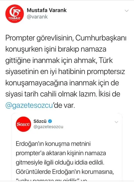 Varank, "Prompter görevlisinin, Cumhurbaşkanı (Recep Tayyip Erdoğan) konuşurken işini bırakıp namaza gittiğine inanmak için ahmak, Türk siyasetinin en iyi hatibinin promptersız konuşamayacağına inanmak için de siyasi tarih cahili olmak lazım. İkisi de @gazetesozcu'de var" ifadelerini kullandı.