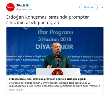 Erdoğan'ın bu hassasiyetini fırsat bilen bazı sözde gazeteler, "Erdoğan prompter bozulunca dondu kaldı" diyerek algı yaratmaya çalıştı. Dakikalar içinde farklı senaryolar yazan bu "gazeteler", gerek sosyal medya gerekse internet sitelerinde yaptıkları yayınlarla bu yalanlarını yayarak vatandaşları yanıltmanın peşine düştü.