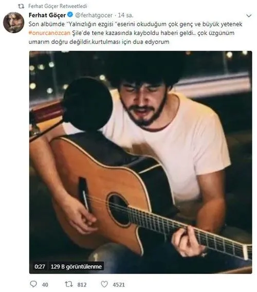 Ünlü şarkıcı Ferhat Göçer Twitter hesabından yaptığı açıklamada "Son albümde "Yalnızlığın ezgisi "eserini okuduğum çok genç ve büyük yetenek Onurcan Özcan'ın Şile'de tekne kazasında kaybolduğu haberi geldi. Çok üzgünüm, umarım doğru değildir, kurtulması için dua ediyorum" dedi.