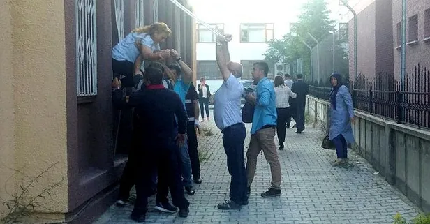 Yangın nedeniyle dumandan etkilenen seçim görevlileri, pencerelerin demir parmaklıkları kesilerek tahliye edildi.