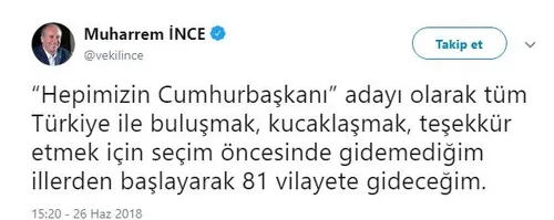 "'Hepimizin Cumhurbaşkanı' adayı olarak tüm Türkiye ile buluşmak, kucaklaşmak, teşekkür etmek için seçim öncesinde gidemediğim illerden başlayarak 81 vilayete gideceğim." dedi.