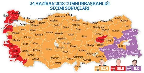 Erdoğan, en düşük oyu yüzde 18 ile Tunceli'den aldı. Tunceli'de, CHP'nin cumhurbaşkanı adayı Muharrem İnce ile HDP'nin cumhurbaşkanı adayı Selahattin Demirtaş'ın arkasında kalan Erdoğan, Hakkâri'de de Demirtaş'ın ardından ikinci olarak yüzde 22 oya ulaşabildi. Türkiye geneline bakıldığında Karadeniz ile İç Anadolu bölgeleri yoğun olarak Erdoğan'a oy verdi. Kıyı kesimlerinde Erdoğan'ın oyu düşerken, Kürtlerin yoğun olarak yaşadığı Doğu ve Güneydoğu'da da Erdoğan'a yüksek oy çıkmadı. CHP'nin adayı İnce yüzde 30, HDP'nin adayı Demirtaş yüzde 8, İYİ Parti'nin cumhurbaşkanı adayı Meral Akşener yüzde 7 oyda kaldı. Saadet Partisi'nin cumhurbaşkanı adayı Temel Karamollaoğlu yüzde 0.9, Vatan Partisi'nin cumhurbaşkanı adayı Doğu Perinçek yüzde 0.2 oy aldı.