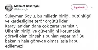 Terörle mücadelede büyük bir kararlılık gösteren Süleyman Soylu'yu hedef alan Bekaroğlu, PKK elebaşı Murat Karayılan'ın daha iyi olduğunu yazdı.