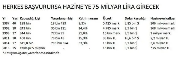 Uzmanlar 25 yaş ve üstündekilerin bedelli askerlik bekleyen kitlenin yaklaşık yüzde 90'ını oluşturduğunu bildiriyor. Buna göre, bedelli yasasından yararlanabilecek yaklaşık 5 milyon kişinin tamamı başvuruda bulunursa, Hazine'ye tam 75 milyar liralık katkı sağlanacak.
