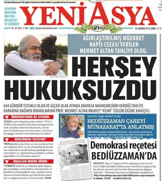FETÖ üyeliği nedeniyle cezaevinde bulunan ve bu suçtan dolayı "ağırlaştırılmış müebbet hapis" cezası alan Mehmet Altan'ı da manşetten savunan Yeni Asya, "Her şey hukuksuzdu" manşeti atarak Altan'ın masum olduğu algısı yaratmıştı.