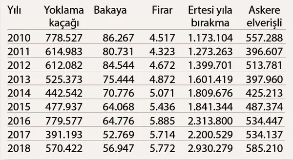 TSK'nın 2017 istatistikleri, "Yoklama kaçağının 391 bin 193, 52 bin 769 bakaya, 5 bin 714 firar, 2 milyon 200 bin 529 ertesi yıla bırakma, 466 bin 220 sevk geciktirmesi, 53 bin 907 askere elverişli değildir raporu, 534 bin 137 kişinin de askere elverişli" olduğunu ortaya koydu. 2018 yılında ise bu rakamlar 585 bin 210 askere elverişli olan, 570 bin 422 yoklama kaçağı, 56 bin 947 bakaya, 5 bin 772 firar, 2 milyon 930 bin 279 ertesi yıla bırakma şeklinde gerçekleşti. Askerlikle ilişkili kişi sayısı ise 5 milyon 448 bin 858 kişi olarak ortaya çıkıyor. Rakamlar yığılmanın her yıl TSK'nın aldığı önlemlere rağmen kademeli olarak arttığını gösteriyor.
