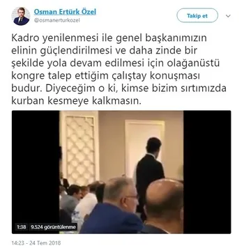 Özel yaptığı paylaşımda "Kadro yenilenmesi ile genel başkanımızın elinin güçlendirilmesi ve daha zinde bir şekilde yola devam edilmesi için olağanüstü kongre talep ettiğim çalıştay konuşması budur. Diyeceğim o ki, kimse bizim sırtımızda kurban kesmeye kalkmasın." dedi.