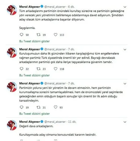 Akşener, "Kuruluşumuzun daha ilk gününden itibaren karşılaştığımız tüm engellemelere rağmen partimiz Türk siyasetinde önemli bir yer edindi. Bayrağı devralacak arkadaşlarımın partimizi çok daha ileriye taşıyacaklarına güvenim tamdır. Tüm arkadaşlarımı partimizin önündeki kurultay sürecine ve partimizin geleceğine yön verecek yeni yönetimini belirlemeye odaklanmaya davet ediyorum. Şimdiden aday olacak tüm arkadaşlarıma başarılar diliyorum." ifadelerini kullandı.