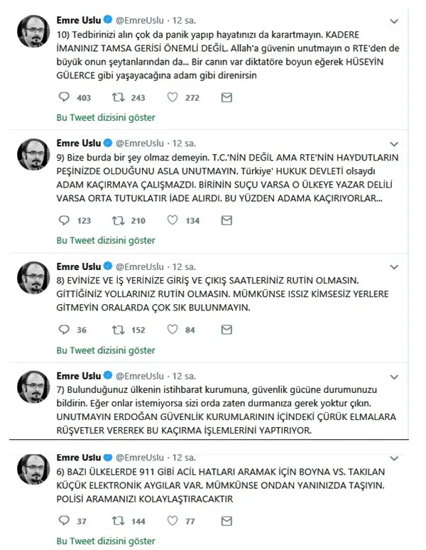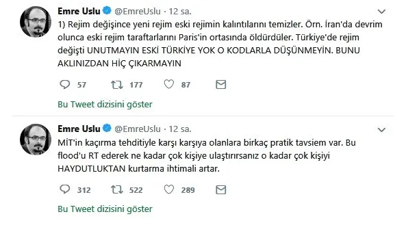 MİT'in dünyanın dört bir yanında yaptığı başarılı operasyonlarla FETÖ'cüleri teker teker yakalaması örgütte büyük panik yarattı. İhanet örgütünün firari isimlerinden Emre Uslu da paniğe kapılanlar arasında. Twitter hesabından peş peşe mesajlar yayınlayan FETÖ'cü Uslu, örgüt üyelerinin yakalanmamaları için yapabileceklerini sıraladı.
