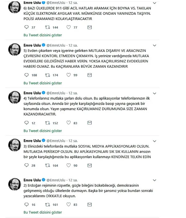 FETÖ'nün ABD'de yaşayan firari isimlerinden Emre Uslu, Twitter hesabından örgüt üyelerine yakalanmamaları için yapmaları gerekenleri yazdı. Uslu bir mesajında ise FETÖ elebaşının talimatını hainlere iletti.