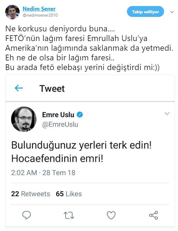 FETÖ'cü Emre Uslu bir diğer mesajında ise FETÖ elebaşının talimatını örgüt üyelerine aktardı. Mesajı paylaşan gazeteci Nedim Şener ise, "Ne korkusu deniyordu buna.... FETÖ'nün lağım faresi Emrullah Uslu'ya Amerika'nın lağımında saklanmak da yetmedi. Eh ne de olsa bir lağım faresi.. Bu arada fetö elebaşı yerini değiştirdi mi:))" diye yazdı.