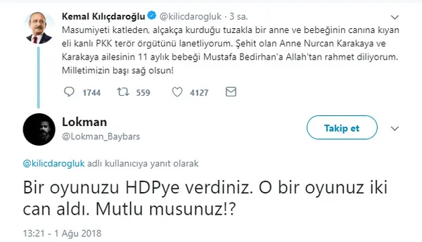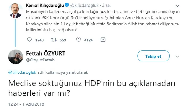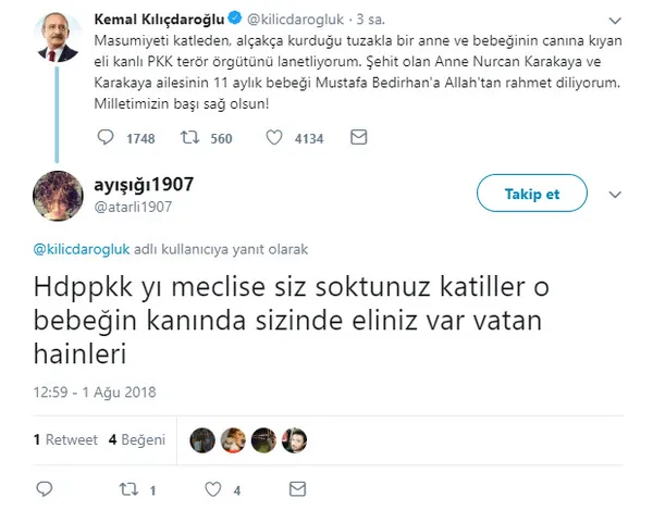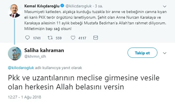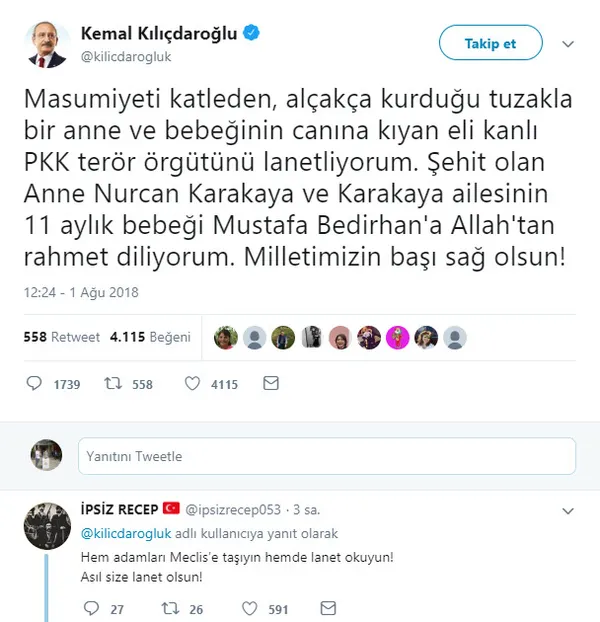 Dökülen şehit kanları canına tak eden vatandaşlar sosyal medya üzerinden örgütlenerek #MeclistePKKistemiyoruz etiketi altında paylaşımlarda bulundu. Vatandaşlar HDP'nin yanı sıra bu günlerin sorumlusu olarak gördükleri CHP'lilere de öfke kusarken, Kılıçdaroğlu'nun yapmış olduğu kınama mesajının altında sert eleştirilerde bulundu.