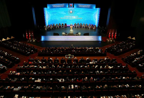 Başkan Recep Tayyip Erdoğan Cumhurbaşkanlığı Külliyesi'nde 100 günlük eylem planını açıkladı. Ekonomiden sanayiye, eğitimden spora, sağlıktan teknolojiye, emeklilerden atama bekleyen öğretmenlere 100 günde yapılacak olan 400 projeyi bir bir sıralayan Başkan Erdoğan Türkiye'ye karşı yürütülen ekonomik savaşı da bozacaklarını belirterek "Bir ekonomik savaşla karşı karşıyayız. Hiç endişe etmeyin, biz bu savaştan da galip çıkacağız." dedi.