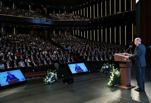 Aziz milletim sizleri en kalbi duygularımla selamlıyorum. Misafirlerimize sizlere milletin evine hoş geldiniz diyorum. Cumhurbaşkanlığı Hükümet sistemine resmen geçtiğimiz 24 Haziran seçim sonuçlarının milletimize hayırlı olmasını Allah'tan temenni ediyorum. Geçmişteki örneklerinden farklı olarak bu dönüşüm tamamen demokratik sistem içinde gerçekleşmiştir. Yeni yönetim sistemimizin demokrasi tarihimizin zirvesini oluşturduğuna inanıyorum. Türkiye yaklaşık 150 yıllık geçmişe sahip yönetim sistemi arayışında tarihi dönüşümünü başarıyla tamamlamıştır. Ülkemizin istikbalinde emeği geçmiş herkesi rahmetle yad ediyorum. Bugünkü proje toplantımızı önemli bir adım olarak görüyorum. Amacımız ecdadımızdan aldığımız emaneti daha yükseklere çıkartarak gelecek nesillere aktarmaktır.Bir yandan yeni yönetim sisteminin mimarisini oluşturuyor, diğer yandan milletimize verdiğimiz sözleri hayata geçirerek projeleri hazırlıyoruz.
