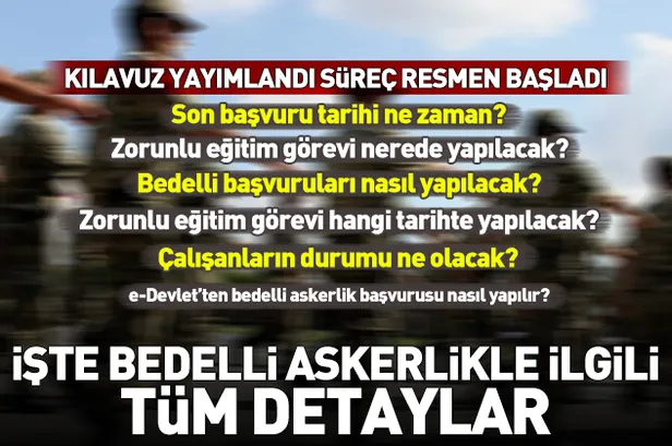 Geçtiğimiz günlerde Meclis'ten geçen ardından bu gece sabaha karşı Resmi Gazete'de yayımlanarak yürürlüğe giren bedelli askerlikle ilgili başvuru kılavuzu yayımlamdı. Peki ama bedelli askerlik başvuruları ne zaman başlayacak? Bedelli askerlikte zorunlu görev ne zaman yapılacak? Bedelli askerlikte zorunlu görev nerede yapılacak? e-Devlet'ten bedelli askerlik başvurusu nasıl yapılır? İşte bedelli askerlik kılavuzu ve bedelli askerlikle ilgili diğer detaylar...