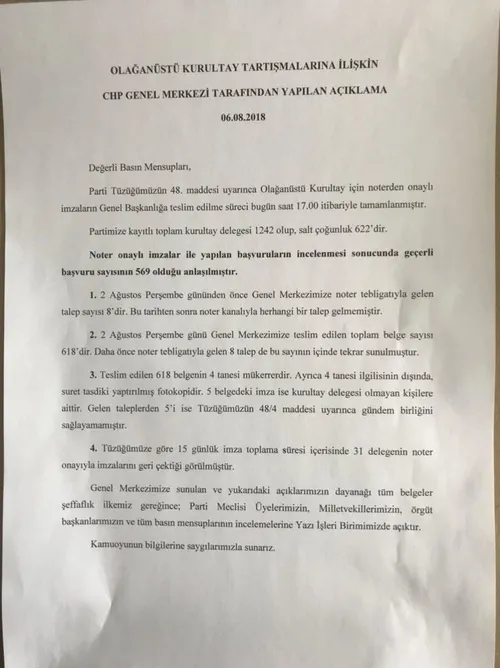 3. Teslim edilen 618 belgenin 4 tanesi mükerrerdir. Ayrıca 4 tanesi ilgilisinin dışında, suret tasdiki yaptırılmış fotokopidir. 5 belgedeki imza ise kurultay delegesi olmayan kişilere aittir. Gelen taleplerden 5'i ise Tüzüğümüzün 48/4 maddesi uyarınca zorunlu olan gündem birliğini sağlayamamıştır.
