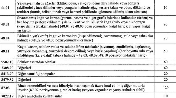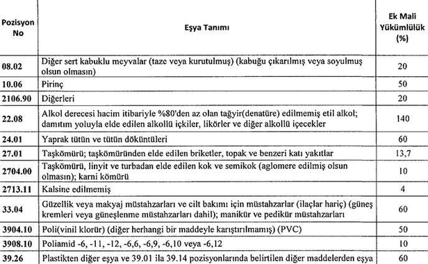 Diğer sert kabuklu meyveler (taze veya kurutulmuş, kabuğu çıkarılmış veya soyulmuş olsun olmasın) yüzde 20, pirinç yüzde 50, diğerleri yüzde 20, alkol derecesi hacim itibarıyla yüzde 80'den az olan tağyir (denatüre) edilmemiş etil alkol; damıtım yoluyla elde edilen alkollü içkiler, likörler ve diğer alkollü içecekler yüzde 140, yaprak tütün ve tütün döküntüleri yüzde 60, taş kömürü; taş kömüründen elde edilen briketler, topak ve benzeri katı yakıtlar yüzde 13,7, taş kömürü, linyit ve turbadan elde edilen kok ve semikok (aglomere edilmiş olsun olmasın); karni kömürü yüzde 10, kalsine edilmemiş yüzde 4, güzellik veya makyaj müstahzarları ve cilt bakımı için müstahzarlar (ilaçlar hariç, güneş kremleri veya güneşlenme müstahzarları dahil); manikür ve pedikür müstahzarları yüzde 60, poli (vinil klorür, diğer herhangi bir maddeyle karıştırılmamış, PVC) yüzde 50, poliamid -6, -11, -12, -6,6, -6,9, -6,10 veya -6,12 yüzde 10, plastikten diğer eşya ve 39.01 ila 39.14 pozisyonlarında belirtilen diğer maddelerden eşya yüzde 60, yakmaya mahsus ağaçlar (kütük, odun, çalı-çırpı demetleri halinde veya benzeri şekillerde); ince dilimler veya yongalar halinde ağaç; testere talaşı ve odun, döküntü ve artıkları (kütük, briket, topak veya benzeri şekillerde aglomere edilmiş olsun olmasın) yüzde 10, sıvanmamış kağıt ve karton (yazma, basma ve diğer grafik işlerinde kullanılan türden) ve her boyutta perfore edilmemiş delikli kart ve delikli şerit kağıt (rulo veya dikdörtgen -kare dahil- tabaka halinde), (48.01 ve 48.03 pozisyonundaki kağıt hariç); el yapısı kağıt ve karton yüzde 20, birincil elyaf (kraft) kağıt ve kartonları (kuşe edilmemiş, sıvanmamış, rulo veya tabaka halinde, 48.02 ve 48.03 pozisyonundakiler hariç) yüzde 20, kağıt, karton, selüloz vatka ve selüloz liften tabakalar (sıvanmış, emdirilmiş, kaplanmış, yüzeyleri boyanmış, yüzeyleri dekore edilmiş veya baskı yapılmış, her boyutta rulo veya dikdörtgen -kare dahil- tabaka halinde, 48.03, 48.09, 48.10 pozisyonundakiler hariç) yüzde 50, suni filament demetleri selüloz asetattan olanlar yüzde 60, diğerleri yüzde 60, diğer santrifüj pompalar yüzde 20, diğerleri yüzde 20, binek otomobilleri ve esas itibarıyla insan taşımak üzere imal edilmiş diğer motorlu taşıtlar (87.02 pozisyonuna girenler hariç, steyşın vagonlar ve yarış arabaları dahil) yüzde 120, diğer amaçlarla kullanılanlar yüzde 10. Bu kararın yayımı tarihinden önce Türkiye'ye sevk edilmek üzere bir taşıma belgesi düzenlenerek yüklemesi yapılmış eşyanın, bu kararın yayımı tarihinden itibaren en geç 45 gün içinde ithalatına ilişkin gümrük beyannamesinin tescili veya gümrük mevzuatı çerçevesinde özet beyanın verilmesi dahilinde, bu değişiklik kararından önceki ek mali yükümlülük oranları uygulanacak.