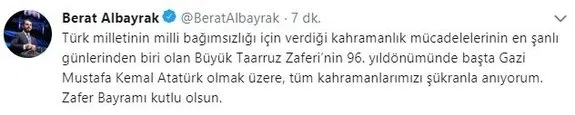 Hazine ve Maliye Bakanı Berat Albayrak 30 Ağustos Zafer Bayramı'na ilişkin mesaj yayımladı.
