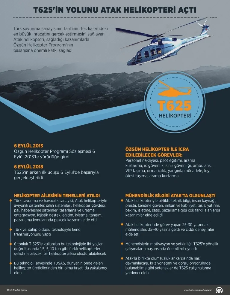 Cumhurbaşkanı Recep Tayyip Erdoğan'ın liderliğinde, devletin savunma sanayisine verdiği destekle T625 helikopterinin TUSAŞ tesislerde tamamen milli olarak üretildiğini vurgulayan Kotil, helikopterin söz verdikleri gibi 6 Eylül 2018 günü saat 06.00'da ilk uçuşunu gerçekleştirdiğini anımsattı.